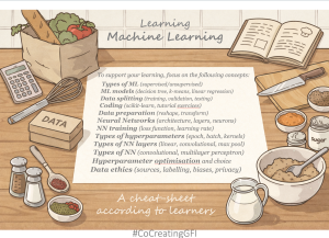 Machine learning is everywhere: from daily use (large language models, image recognition) to applications in the geosciences (weather forecasting, climate modeling). It is quickly becoming a tool that every scientist should become familiar with, and that every student will have to discover and learn about. Based on a conceptual survey collecting data along a pilot course, this cheat-sheet has been generated to help learners: it presents the concepts deemed newest, most important, and difficult across a comprehensive introduction to machine learning and neural networks. Pdf for download here.