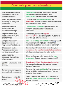 Co-creation occurs when staff and students work collaboratively with one another to create components of curricula and/or pedagogical approaches. But what exactly does this mean? What components or approaches can we co-create, and what does co-creation look like within a higher education classroom? Although we have literally co-created fieldwork journeys with students (Daae et al., 2025), we will here welcome you to join us on a metaphoric co-creation journey through the landscape of opportunities guided by the Norwegian mountain code (Røde Kors, ND). The mountain code (dating back to 1952) is well-known in Norway; kids learn it early, and it is even printed on the wrapping of the popular hiking chocolate, Kvikk Lunsj! Please consider the following rules to enjoy the co-creation adventure while ensuring you and your company stay safe. Pdf available here.